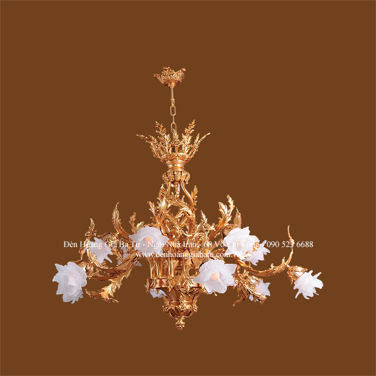 Chất liệu: Đồng nguyên khối được mạ vàng Y ( Pháp ) kết hợp tinh tế những chóa đèn bằng thủy tinh.